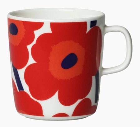 De Oiva mok heeft het Unikko (klaproos) patroon. Marimekko’s beroemde klaproospatroon Unikko werd geboren in 1964. Ontwerper Maija Isola wilde van dit organische thema iets interessants maken en ontwierp een hele reeks bloemenprints. Tegenwoordig staat de iconische bloem voor creativiteit.