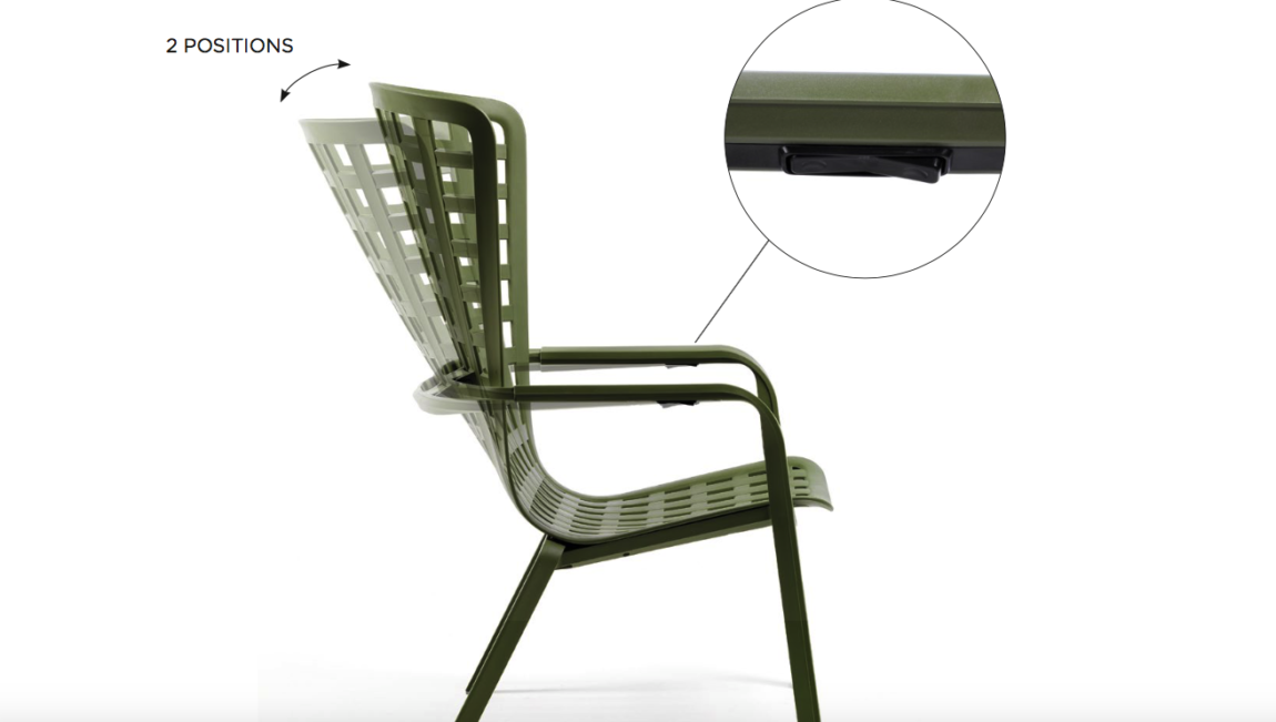 De verstelbare kunststof fauteuil Folio is gemaakt van gekleurde, recyclebare glasvezel polypropyleen, voorzien van UV-additieven, zodat hij zonder problemen in het zonnetje kan staan.