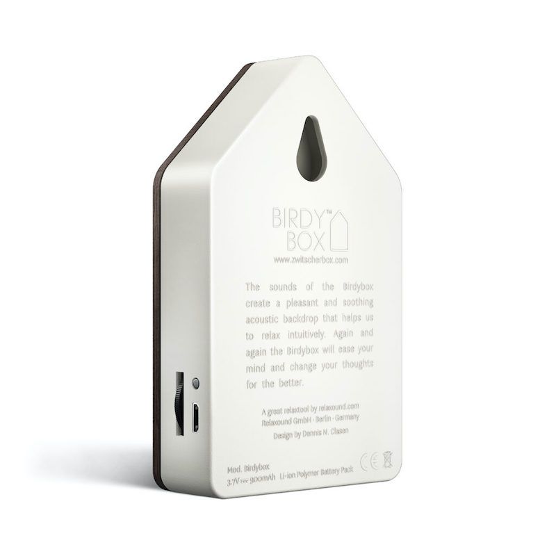 Deze Birdybox heeft de vorm van een vogelhuisje en tovert een glimlach op je gezicht! Geniet van de vrolijke vogelgeluiden en voel je ontspannen terwijl je aan het werk bent of door je huis loopt. De relaxound Birdybox kun je overal plaatsen zoals op je kantoor, hal, badkamer of zelfs op je toilet! Luister naar het getjilp van de vogels en voel je relaxed.