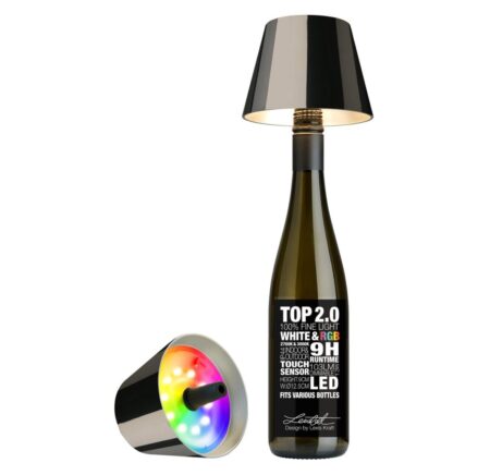 Sompex TOP 2.0 Oplaadbare Flessenlamp is een oplaadbare ledlamp met accu. Bewaar je een mooie fles als herinnering of gebruik je een wijnfles tijdens je vakantie, in een handomdraai heb je een bijzonder lichtobject met de TOP-lamp van Sompex! D00r de conische vorm past de siliconen stop in de meeste flessenhalzen. Creëer je eigen designlamp en zet je fles in de schijnwerpers. De dimbare TOP 2.0 geeft tot 40 uur licht, zowel binnen als buiten. De TOP wordt geleverd in een mooie ronde verpakking en inclusief een usb-c oplader.
